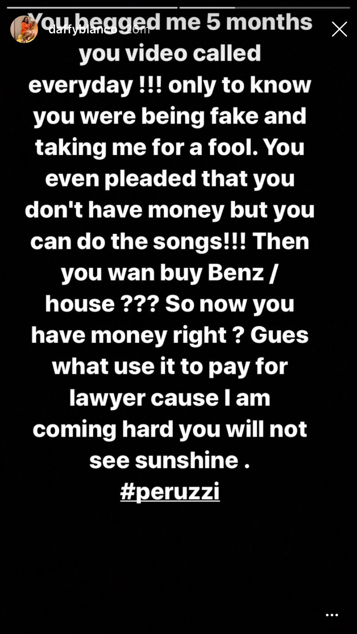 Blanco claimed that she paid the artist an upfront payment of N10 million for his songwriting services. However, in an unexpected turn of events, Blanco in her narration stated that Peruzzi tried to have his way with her against her will.