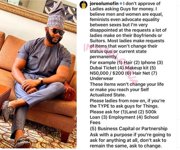 Popular Nigerian relationship therapist, Joro Olumofin took to social media to advise ladies who ask men for money.He stated that if they must ask, they should only ask for money for things that would change their status quo.